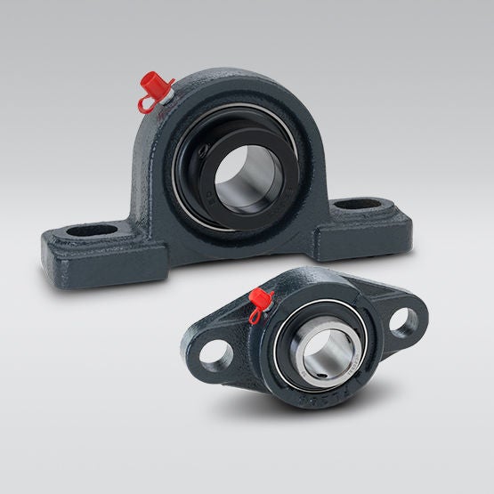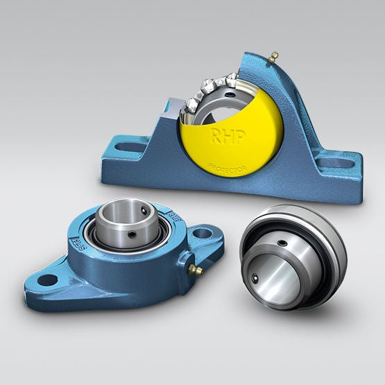 RHP Self-Lube®, Silver-Lube®, Life-Lube and Molded-Oil units include two basic components, the insert and the housing. Each unit consists of a sealed single-row ball bearing with spherical outside diameter and extended inner ring mounted in a pillow block or flanged housing. The spherical fit accommodates initial misalignment.